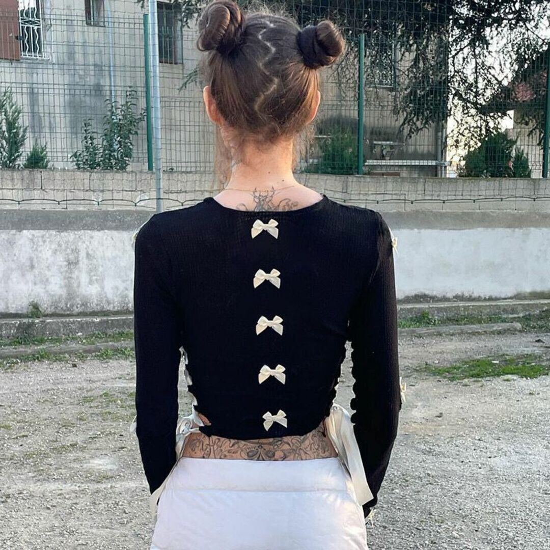 Rockmore Cut-out lace-up ribbon cropped knit black