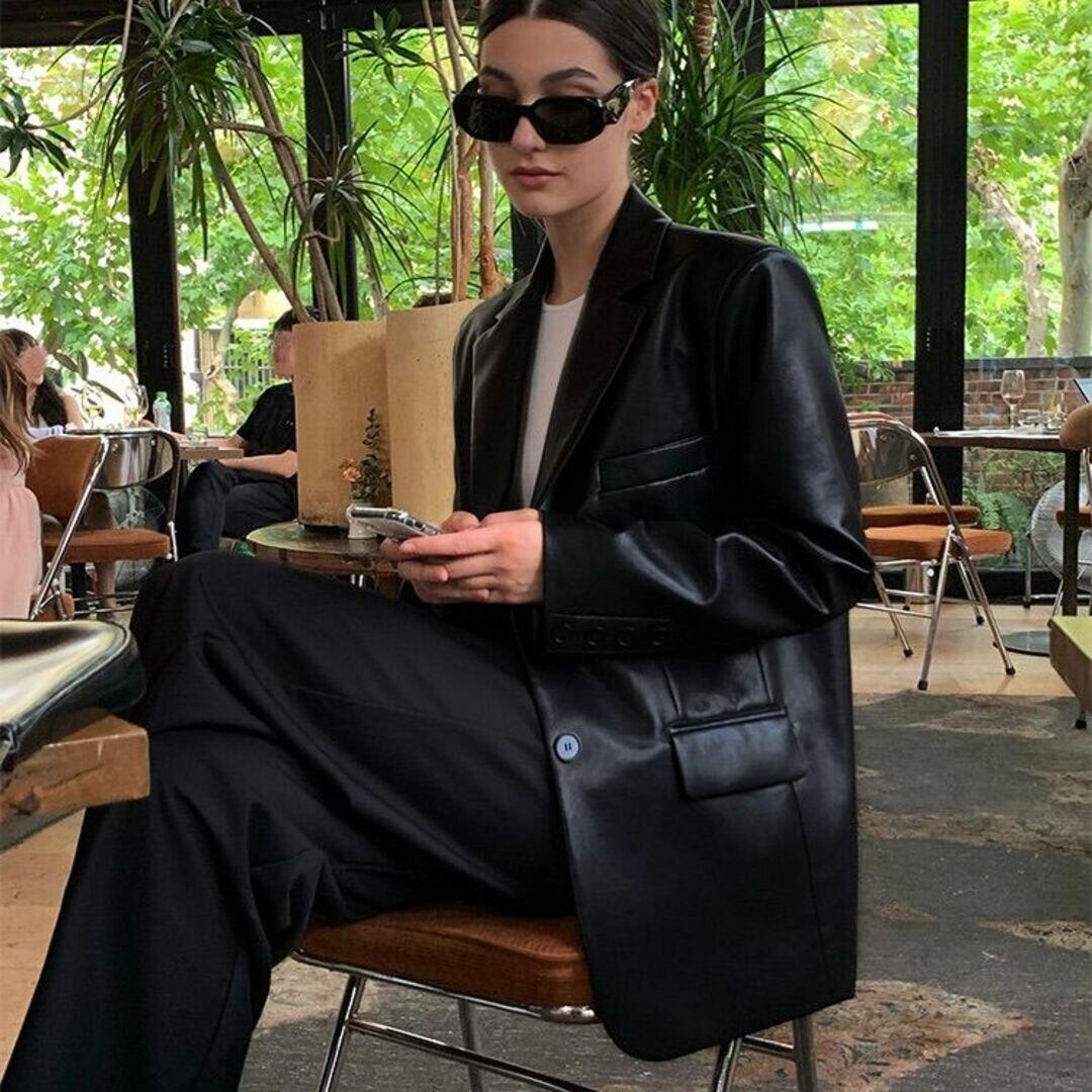 オーバーなサイズ感が可愛いエコレザーのジャケット。