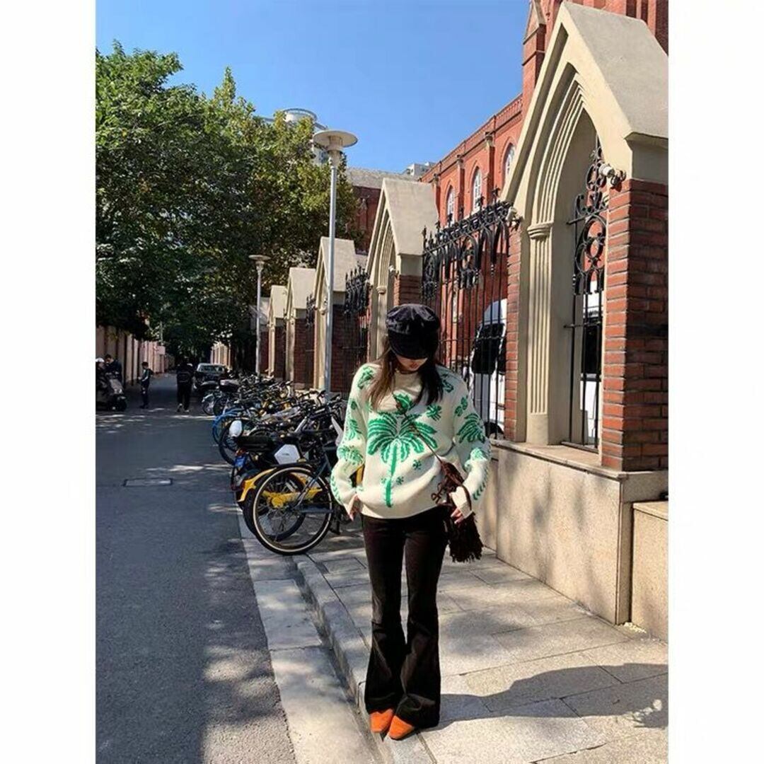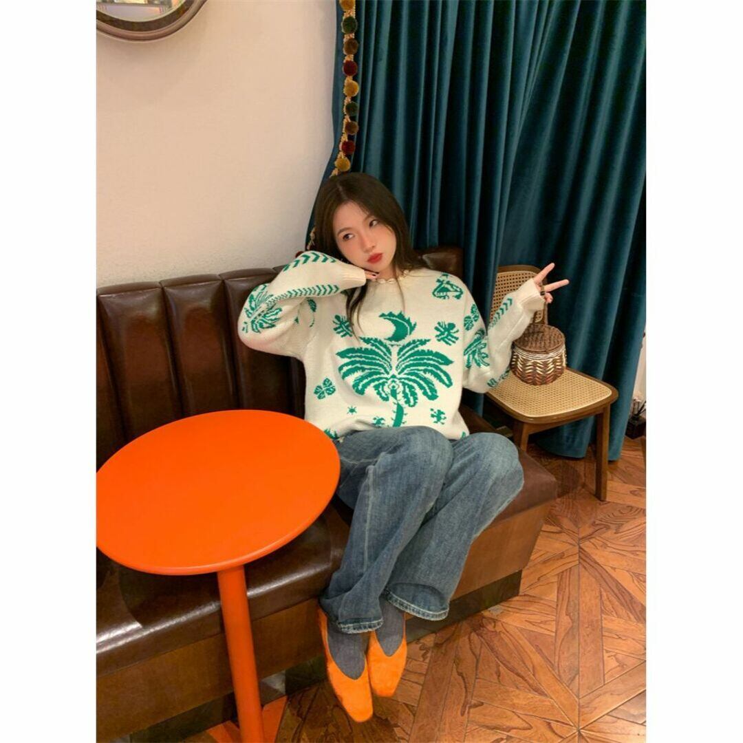 LUOLUOJUANJIE Art Leaf Print Crew Neck Overknit