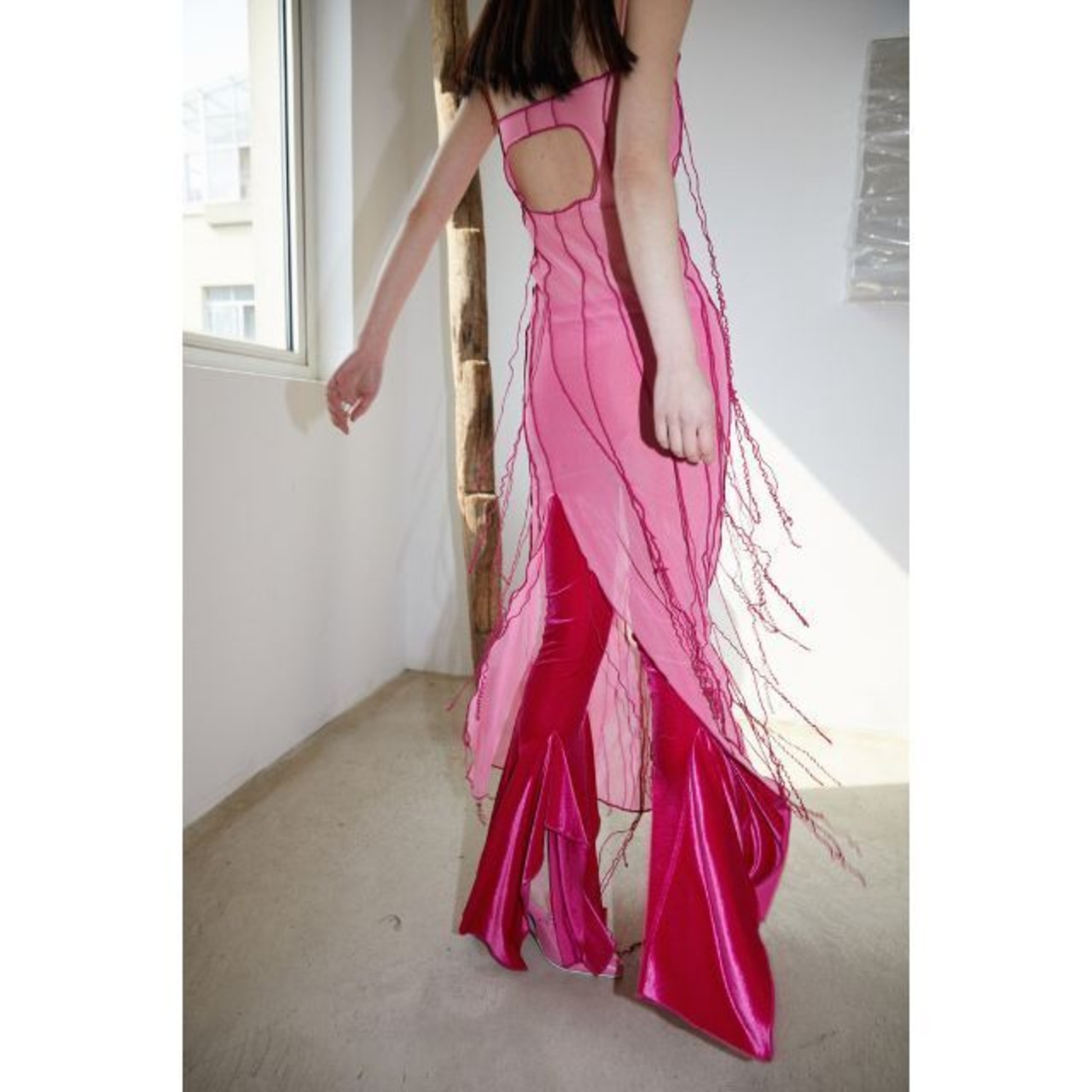 全体にフリンジのように糸が垂れるデザインで、キャミソールの紐部分も細めで繊細な雰囲気に。
