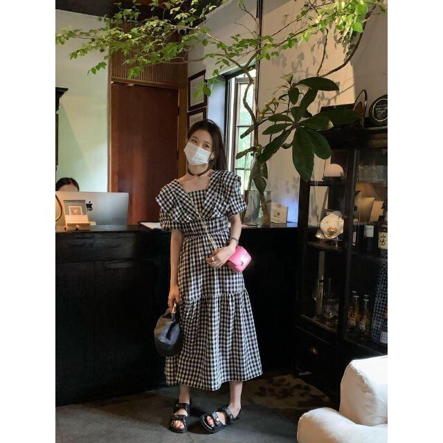 パフスリーブにAライン、大きなギンガムチェックがガーリーで可愛いワンピース。