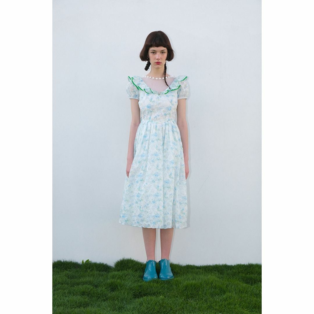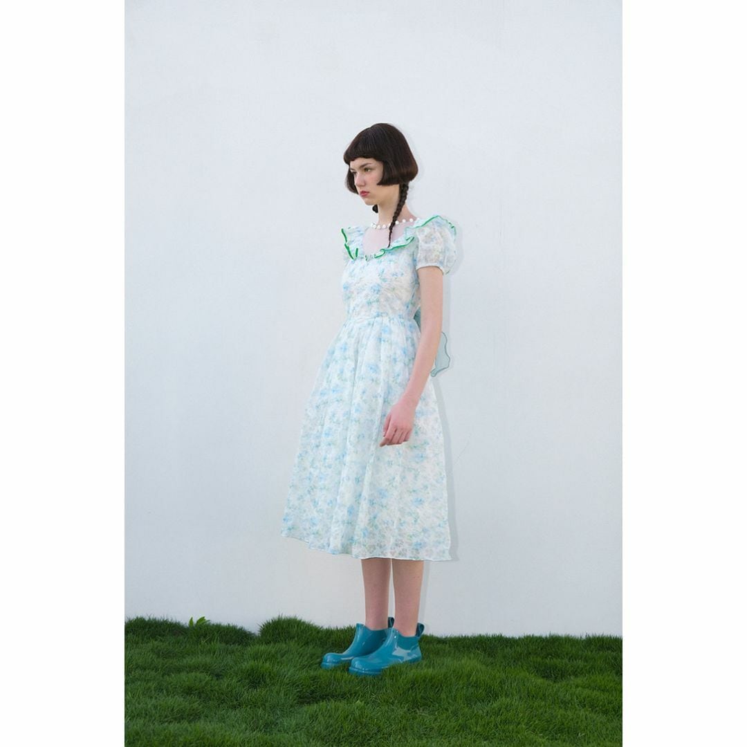 柄が重なったシフォン生地にフリルやリボン、パールなどガーリーなディテールが詰まったワンピース。