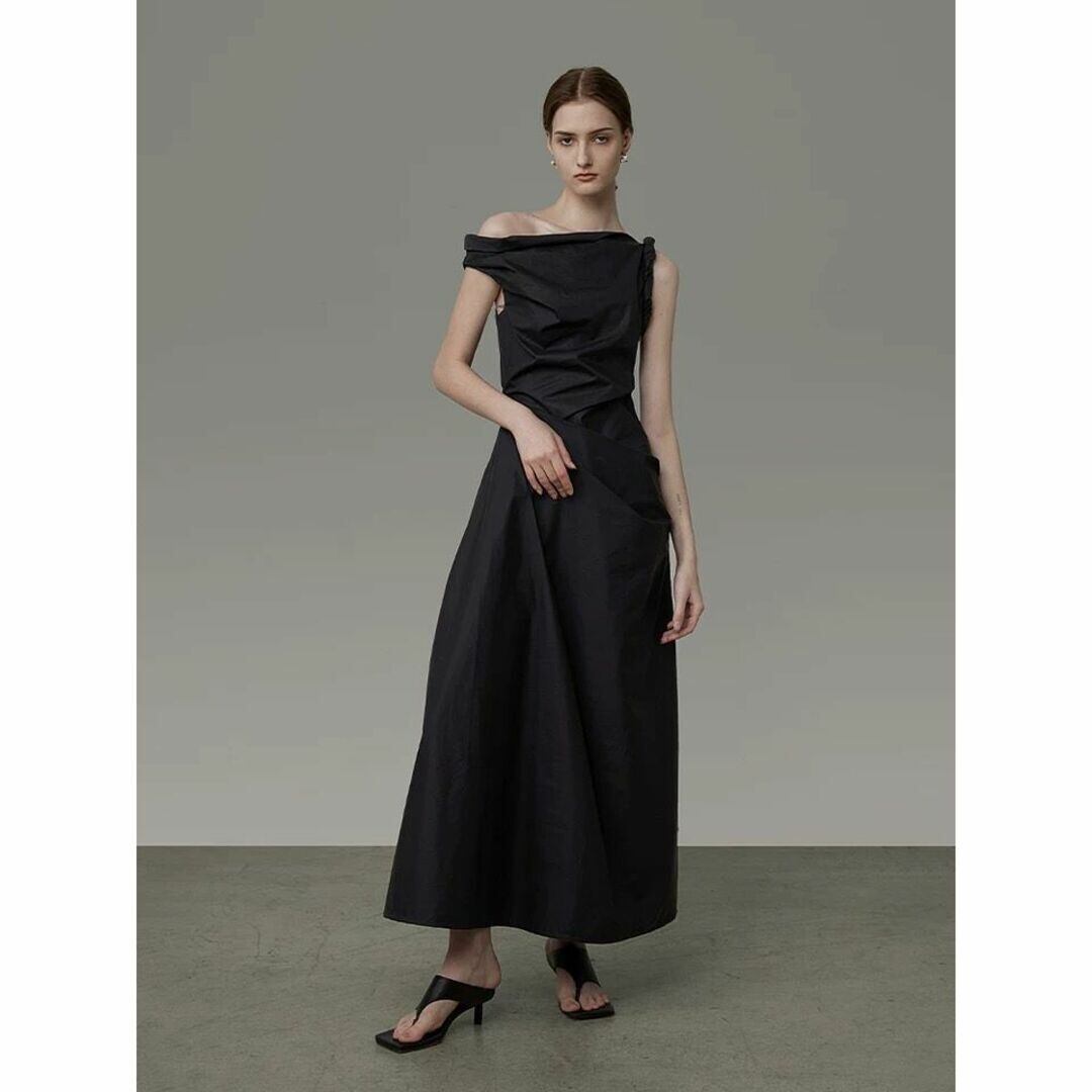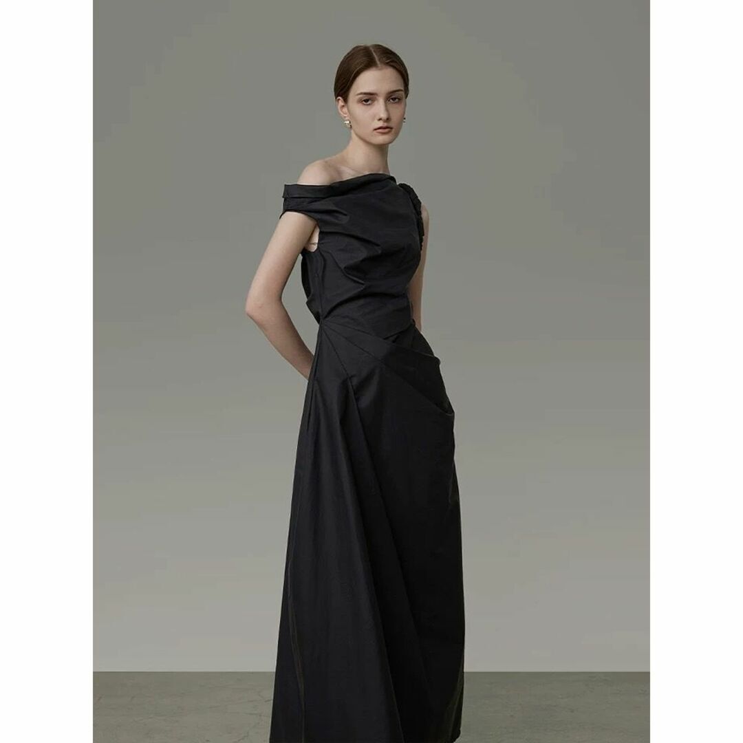 UNSPOKEN French asymmetric tuck three-dimensional long dress
