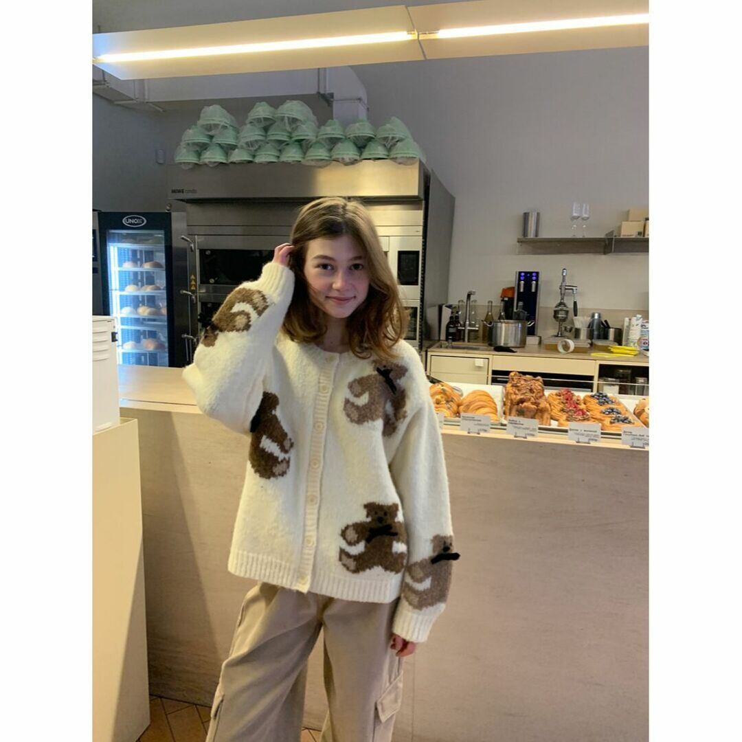 ユニークなくまの柄にリボンがガーリーで可愛いニットカーディガン。