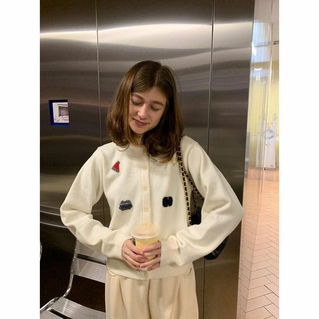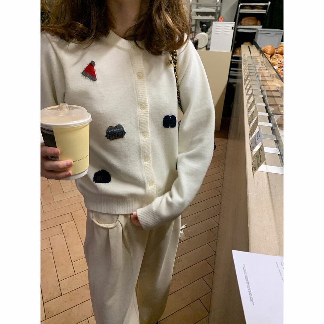 手袋や帽子などの刺繍がユニークで可愛いニットカーディガン。