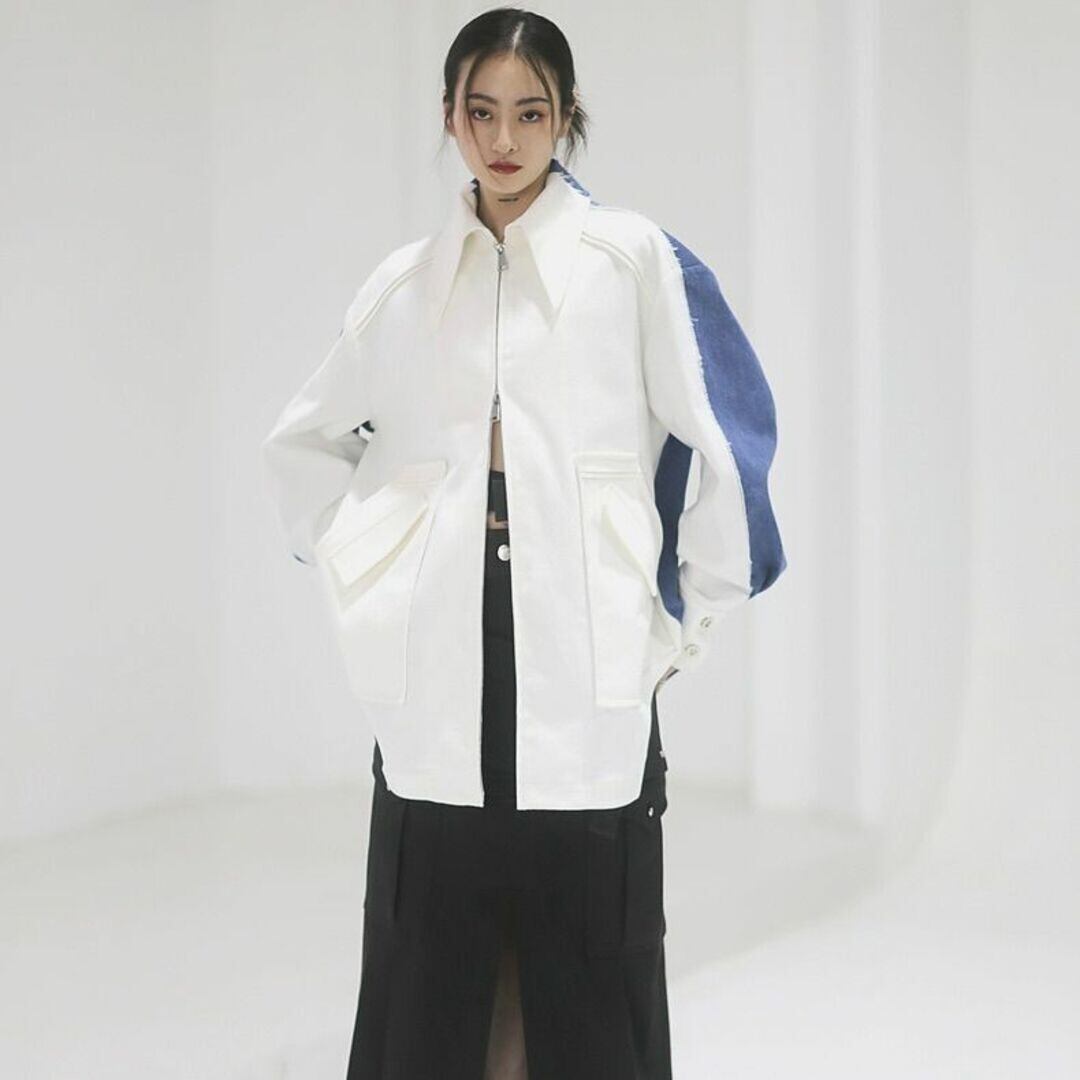 ツートーンのカラーリングや大きなポケット、襟のデザインが目を惹くデニムシャツ。