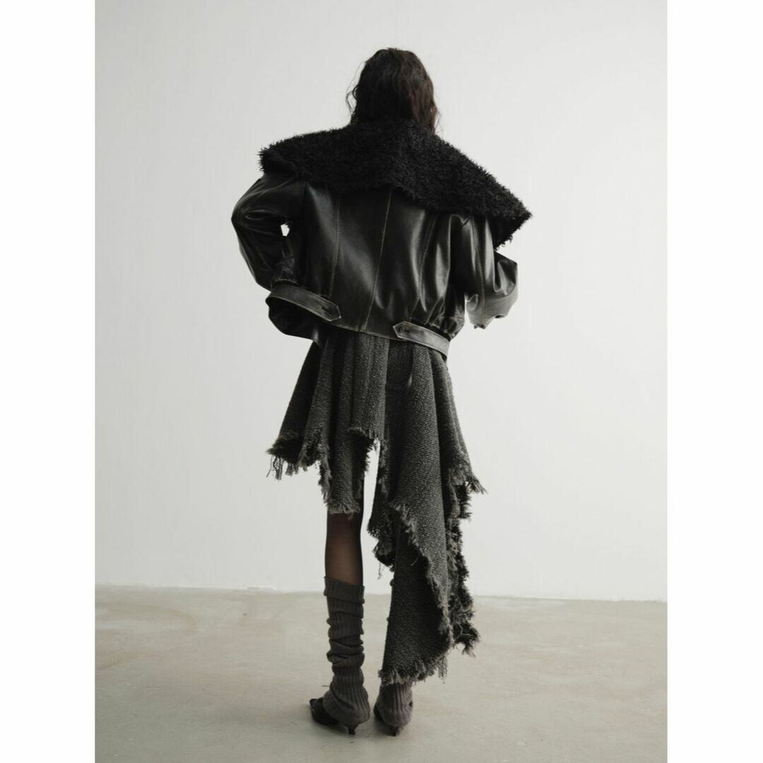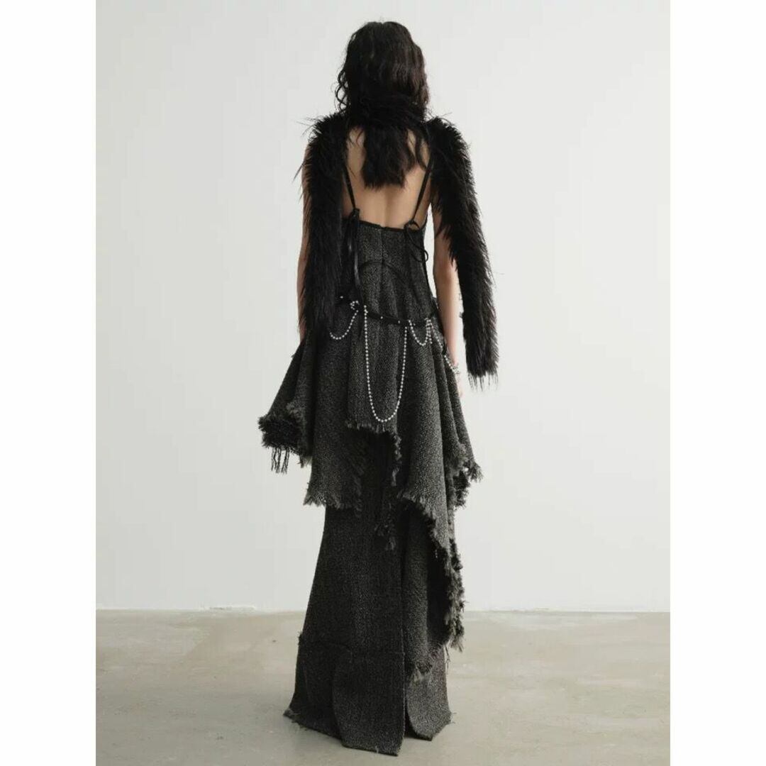 裾のフリンジや大胆なアシンメトリーのデザインが目を惹くワンピース。