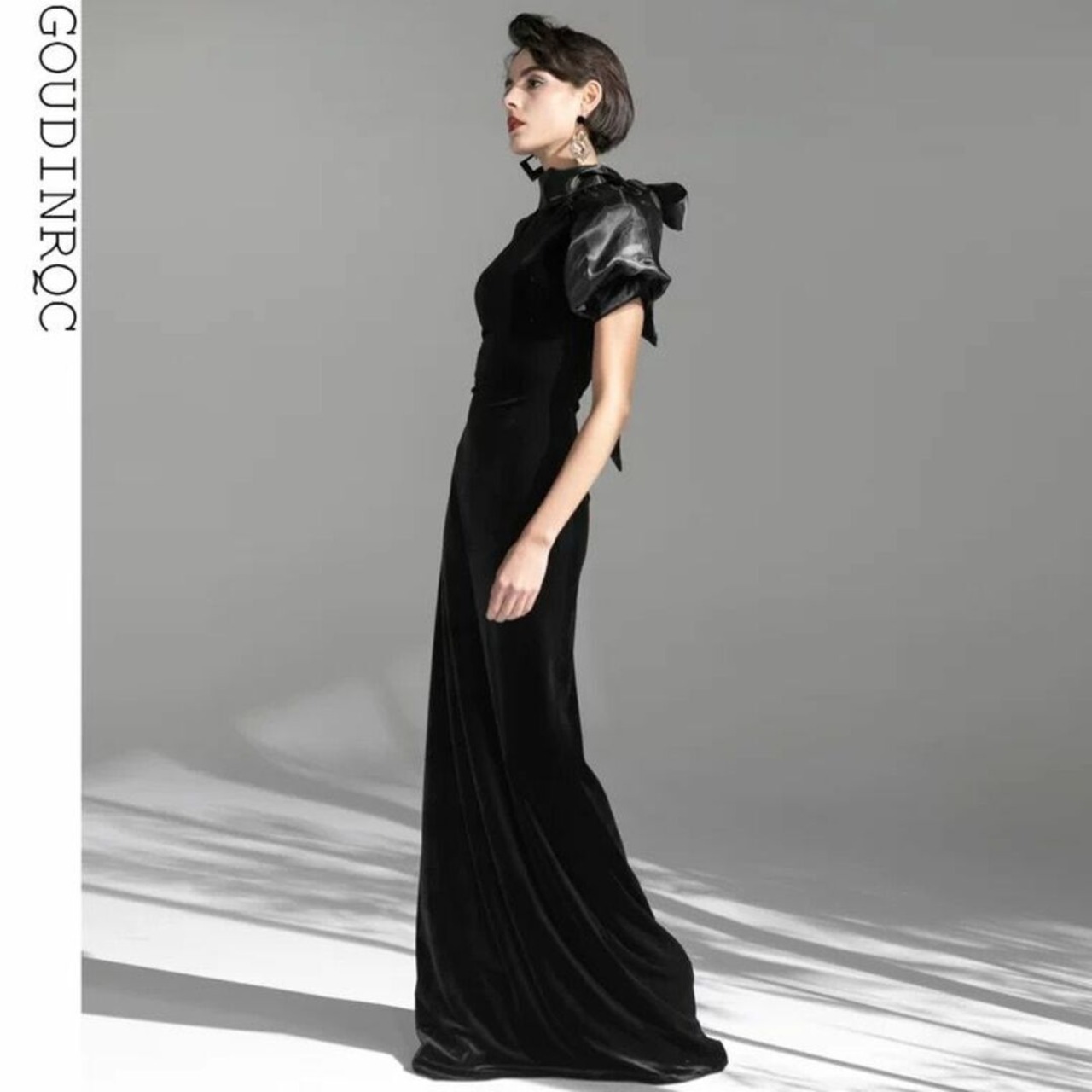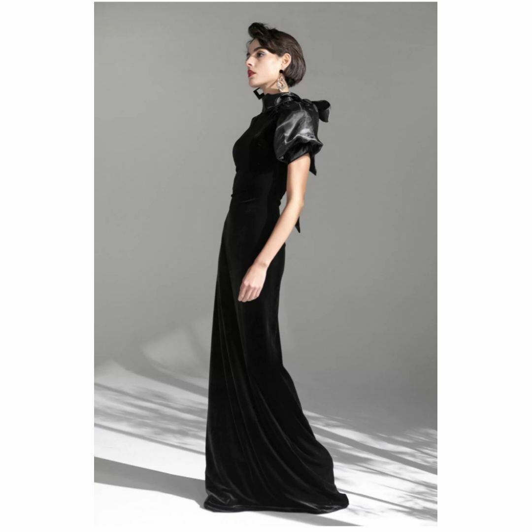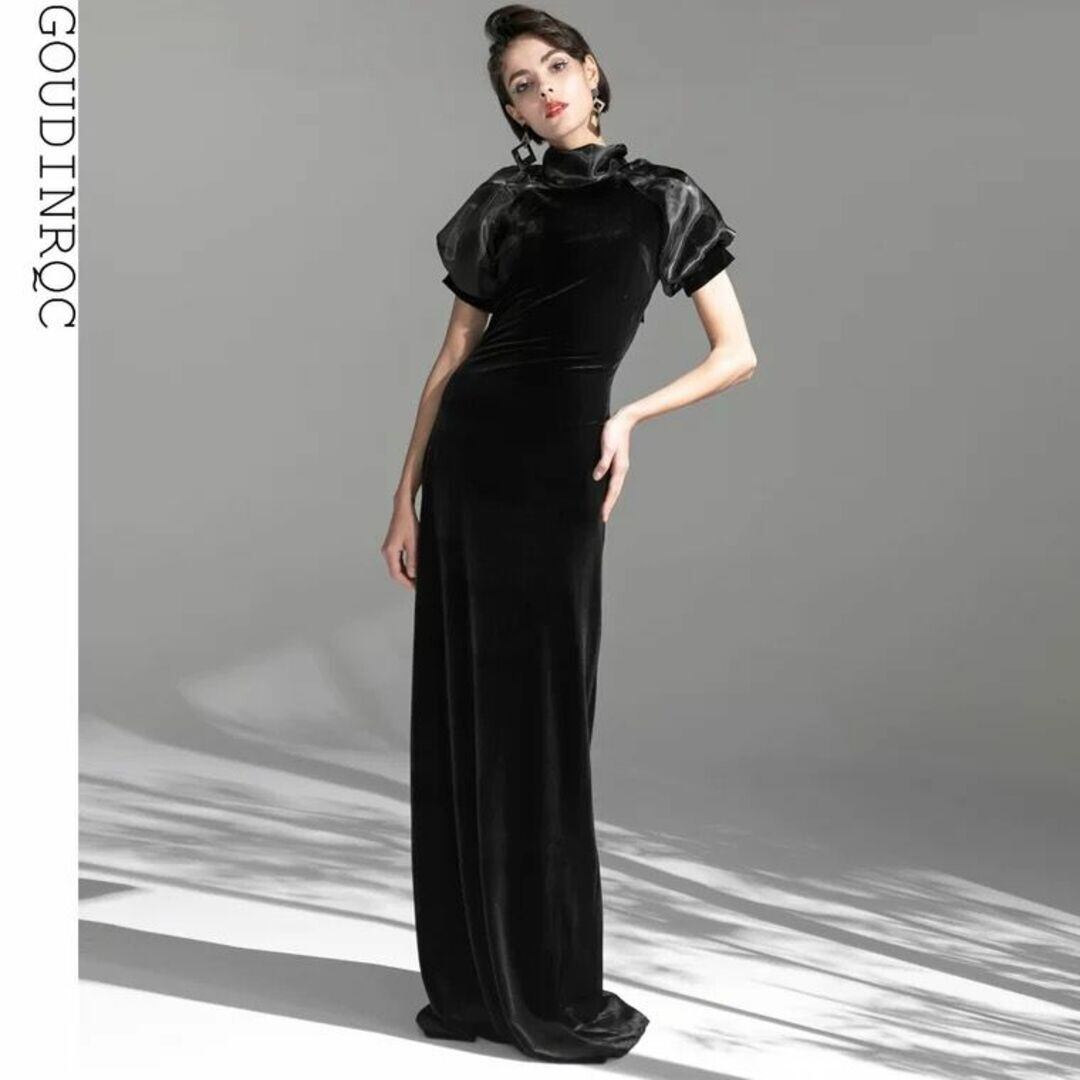 GOUDINRQC Puff sleeve back ribbon velor long dress