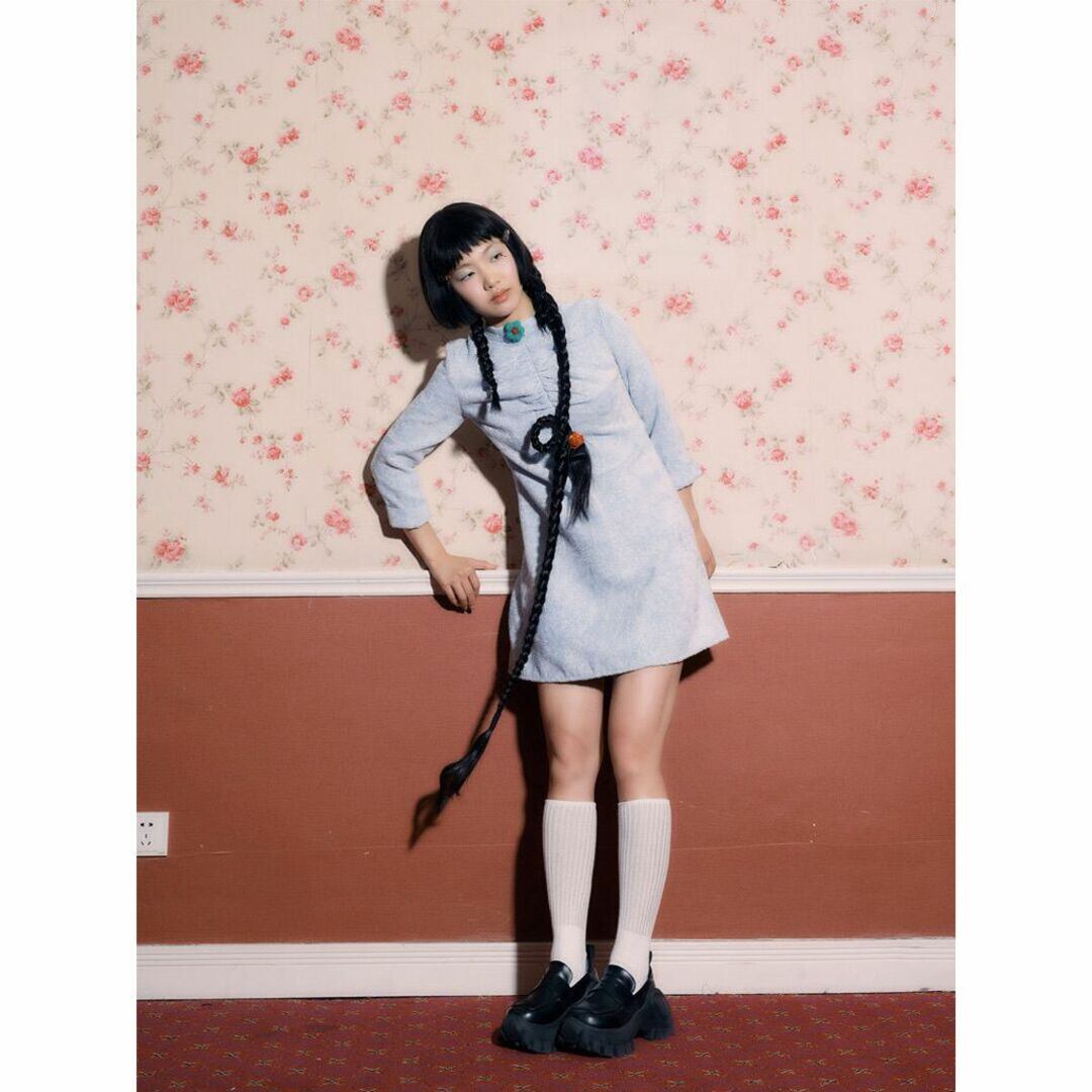 淡いブルーカラーのベロア生地にAラインのミニシルエットがガーリーで可愛いワンピース。
