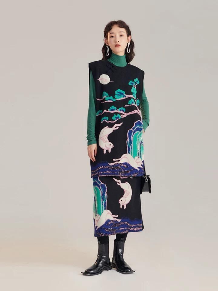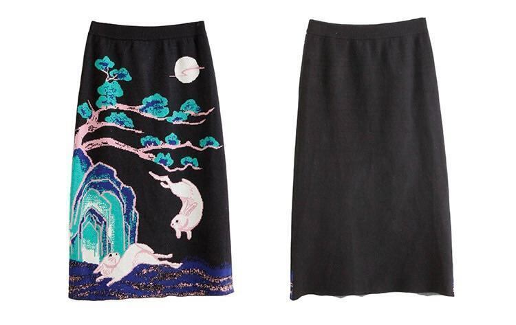 Uare ニットスカート 月とうさぎ オリエンタル スリム Aライン