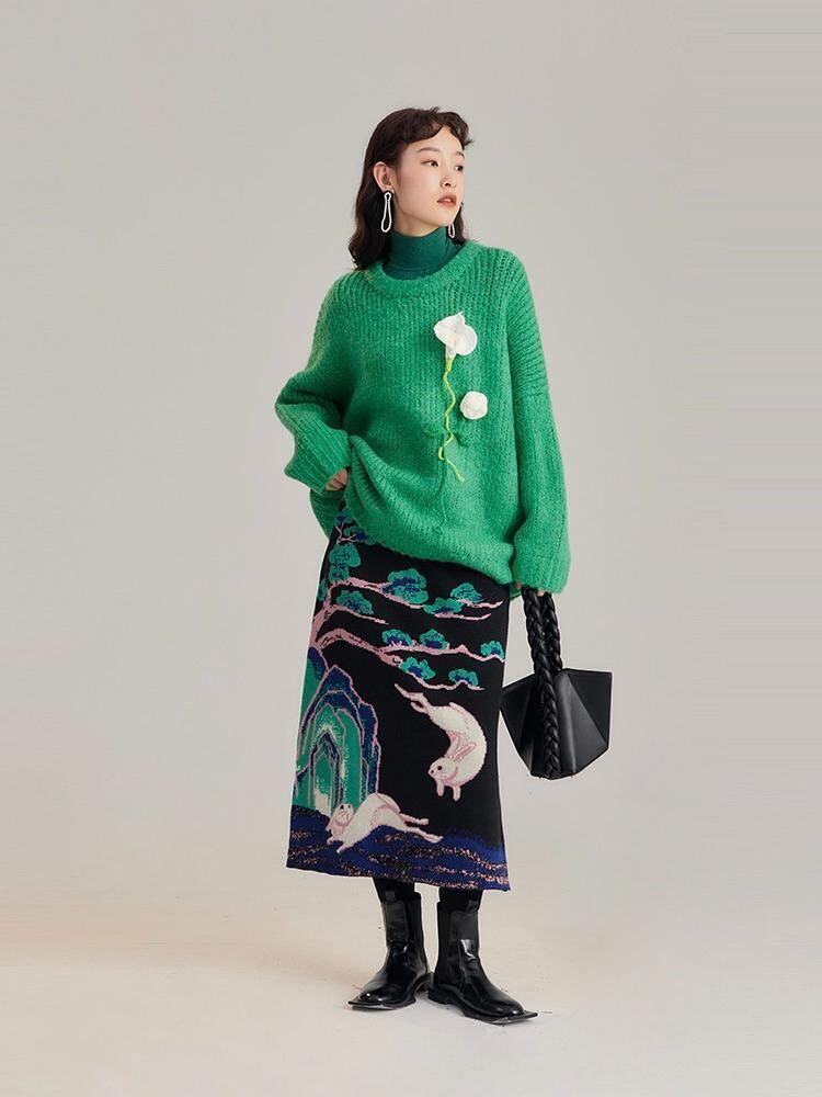 オリエンタルな雰囲気の松やうさぎの柄がコーディネートの主役になるスカートです。