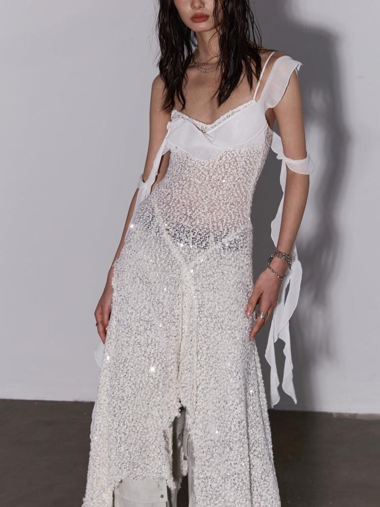 スパンコールや、垂れたリボンが華やかな印象のワンピース。