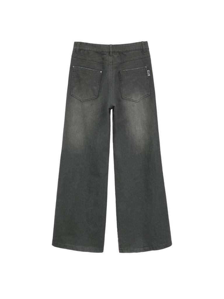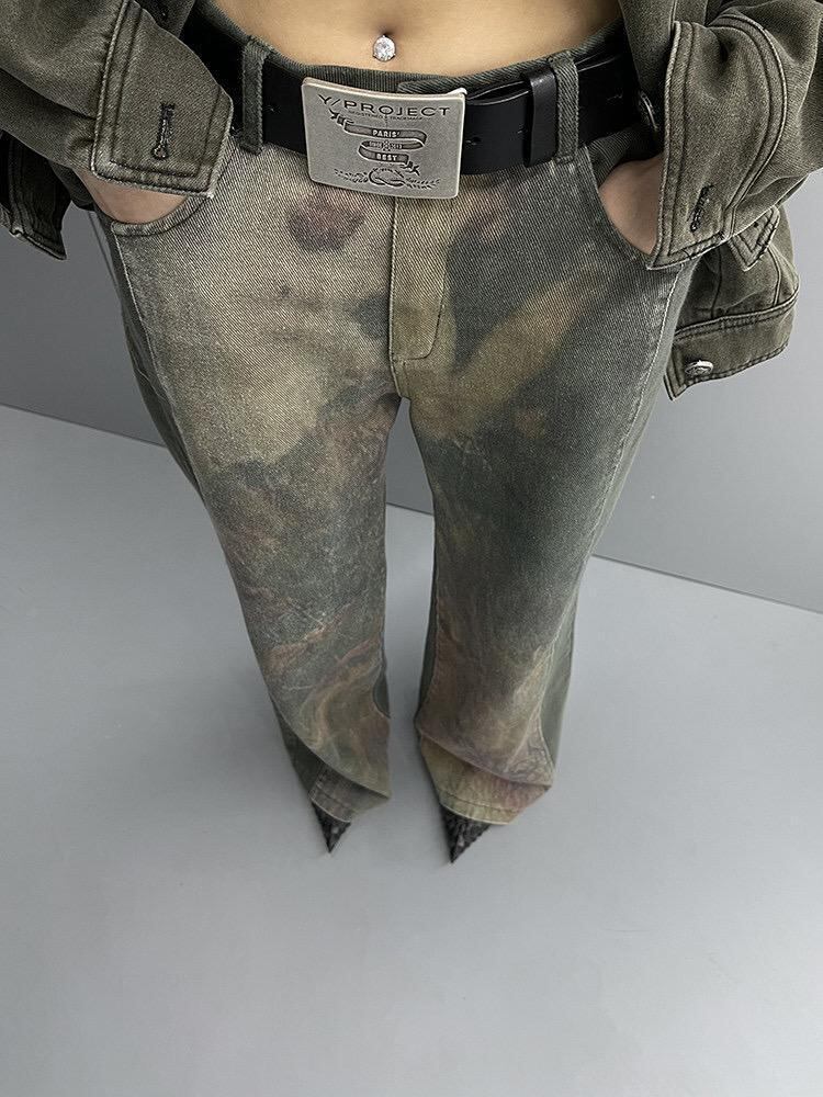 FUZZYKON デニム ストレート ウォッシュ加工 プリント 柄 パンツ