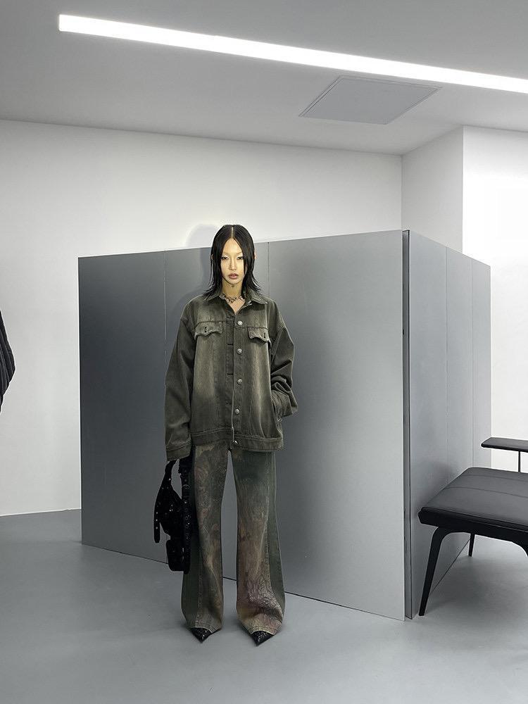 ヴィンテージのようなウォッシュ加工に、淡いカラーのプリントが印象的なデニムです。