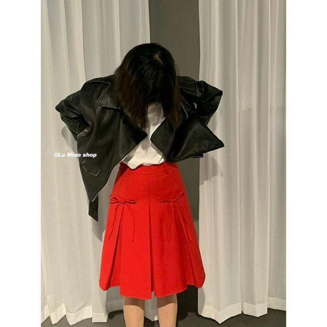 Lumiao リボン スカート ボックスプリーツ レッド 赤 膝丈