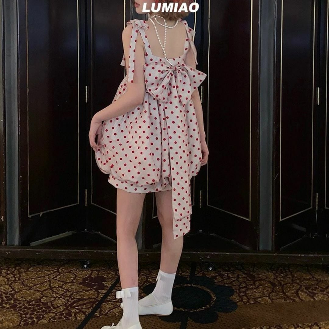Lumiao バックリボン ミニ ワンピース キャミソール バルーン ドット柄