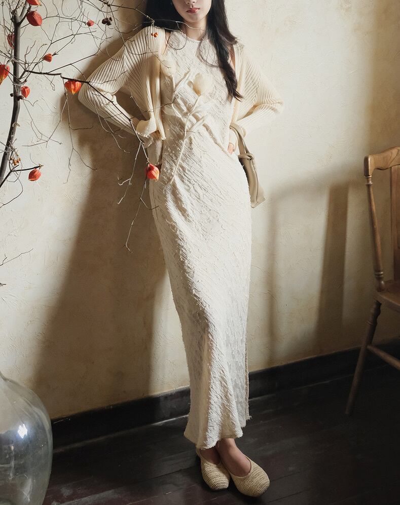 立体的なチューリップとニュアンスのある生地が華やかなワンピース。カジュアルな結婚式やパーティーシーンにもおすすめなドレスです◎