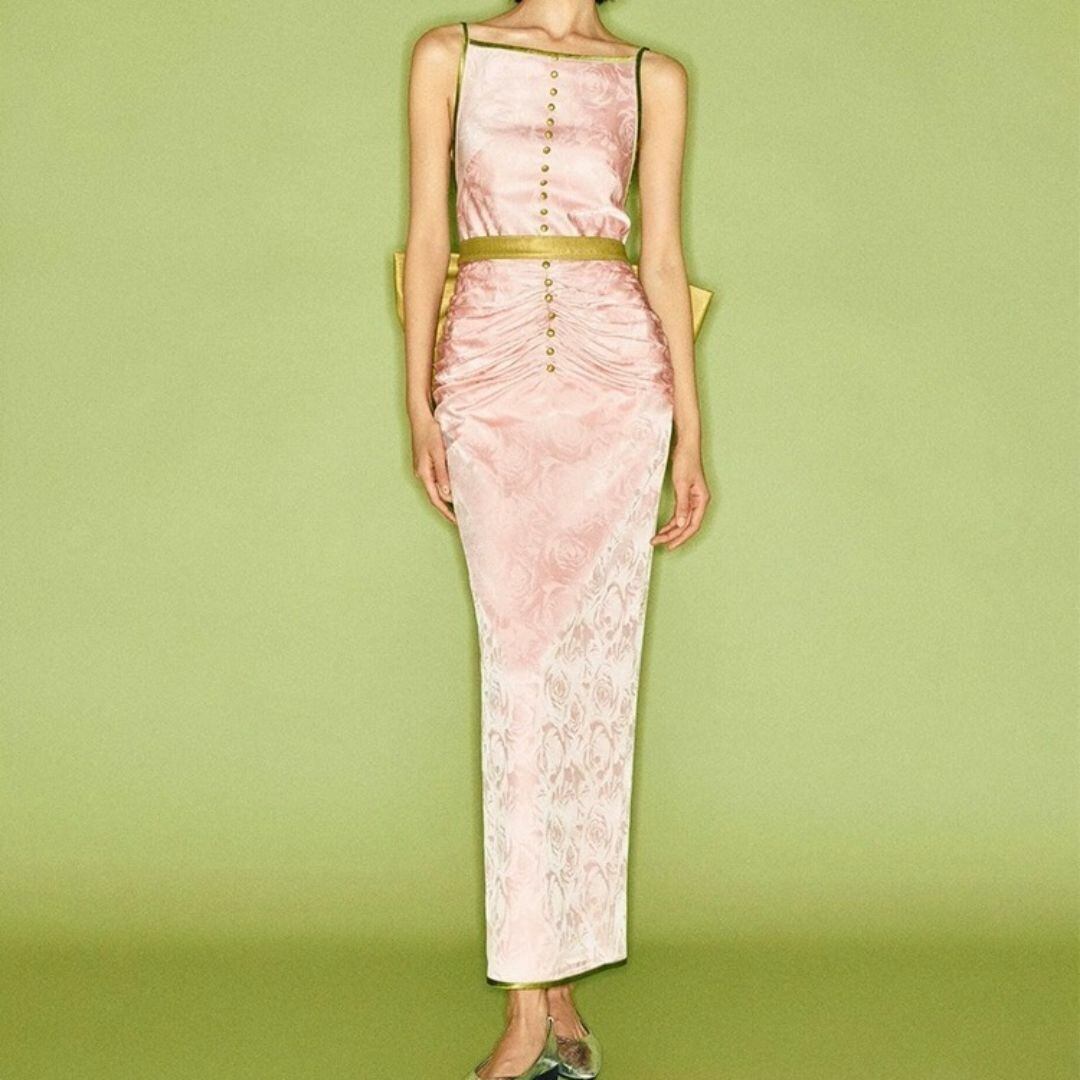 光沢感のある生地に、ずらりと並んだボタンがオリエンタルで華やかなワンピースドレス。結婚式やパーティーシーンにもおすすめなドレスです◎