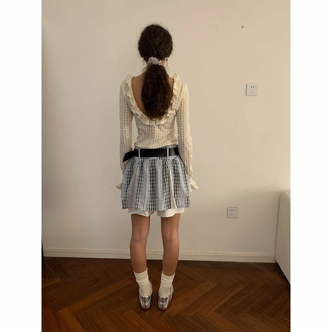 TiaTia ブルーチェック ミニスカパン レース フレア ローウエスト