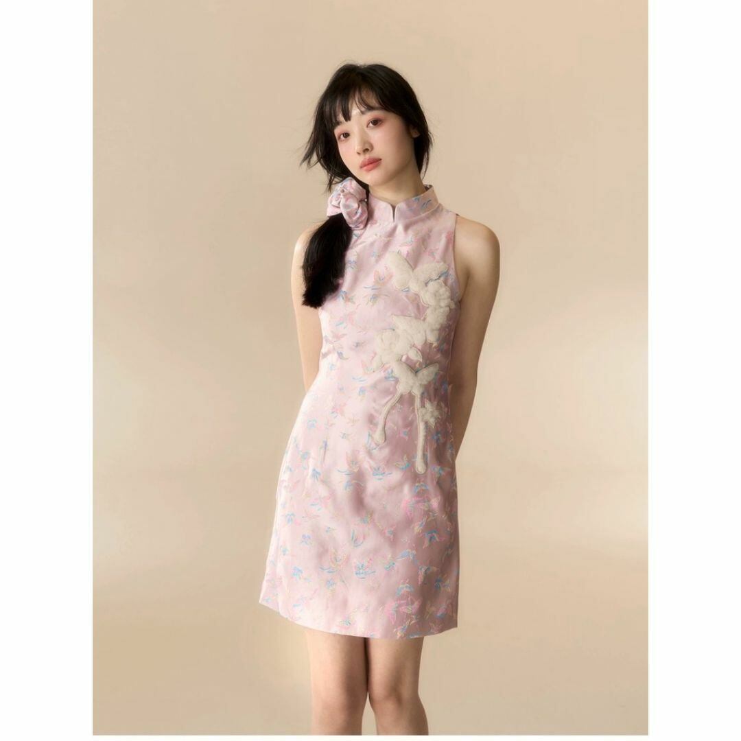 LOUMUTAKU チャイナ ミニ ワンピース ノースリーブ ピンク 蝶々