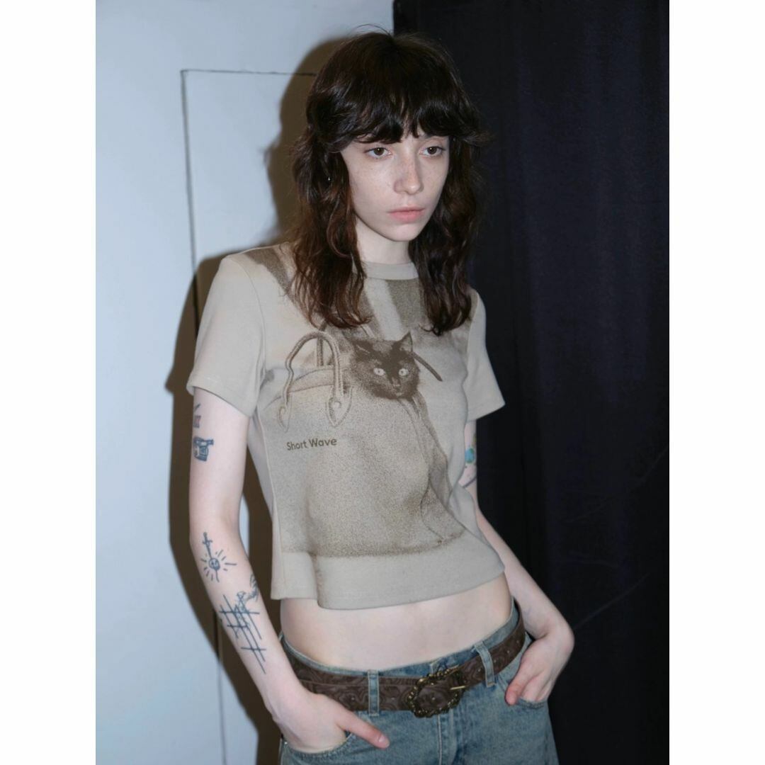 Short Wave Cat in bag ミニ タイト Tシャツ 猫柄