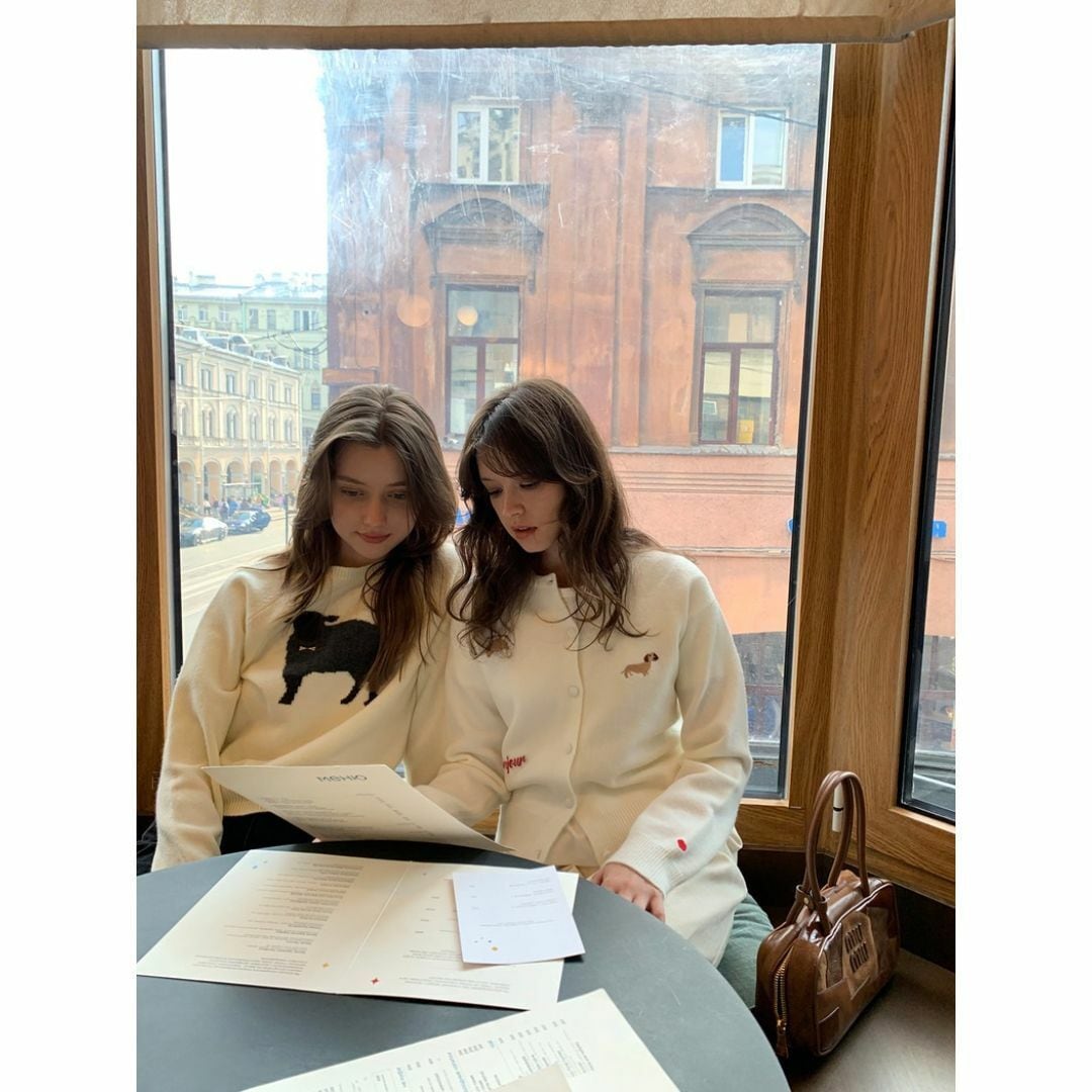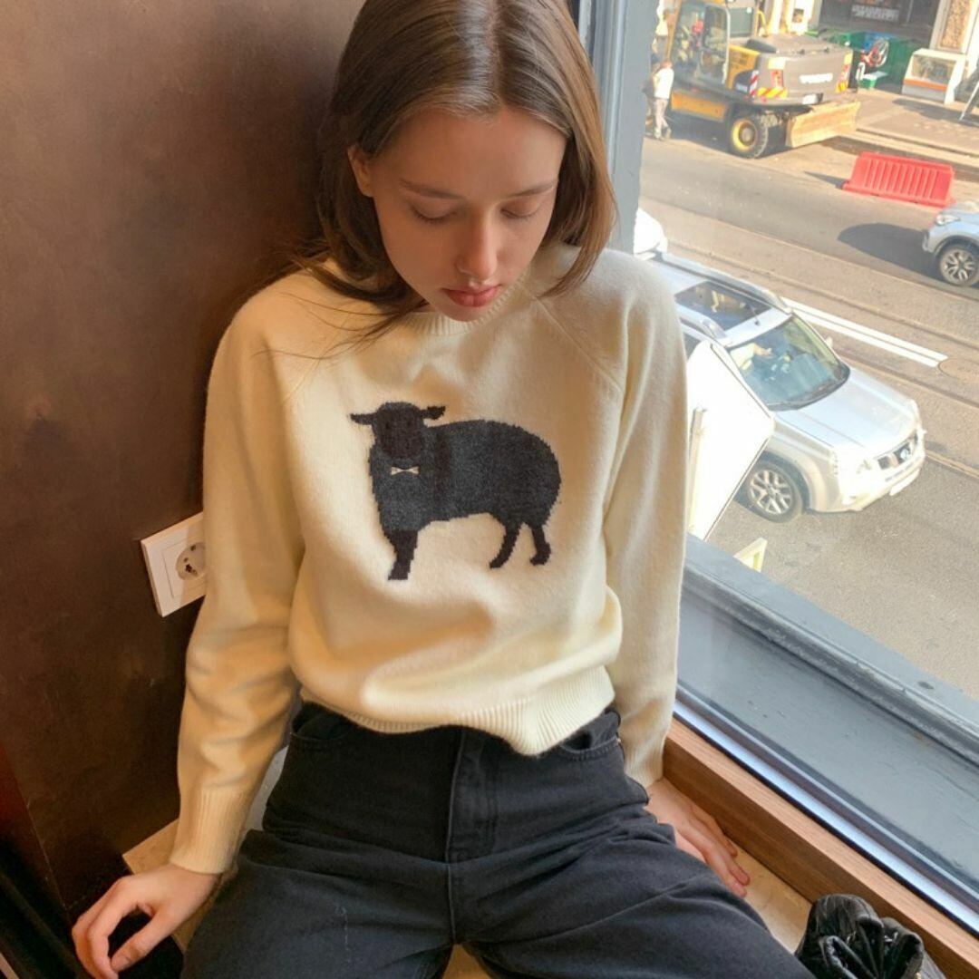 リボンのついたユニークなヤギの柄が可愛いニット。小さすぎず、オーバーではないキッチリ感のあるシルエットでカジュアルにも綺麗めにも◎
