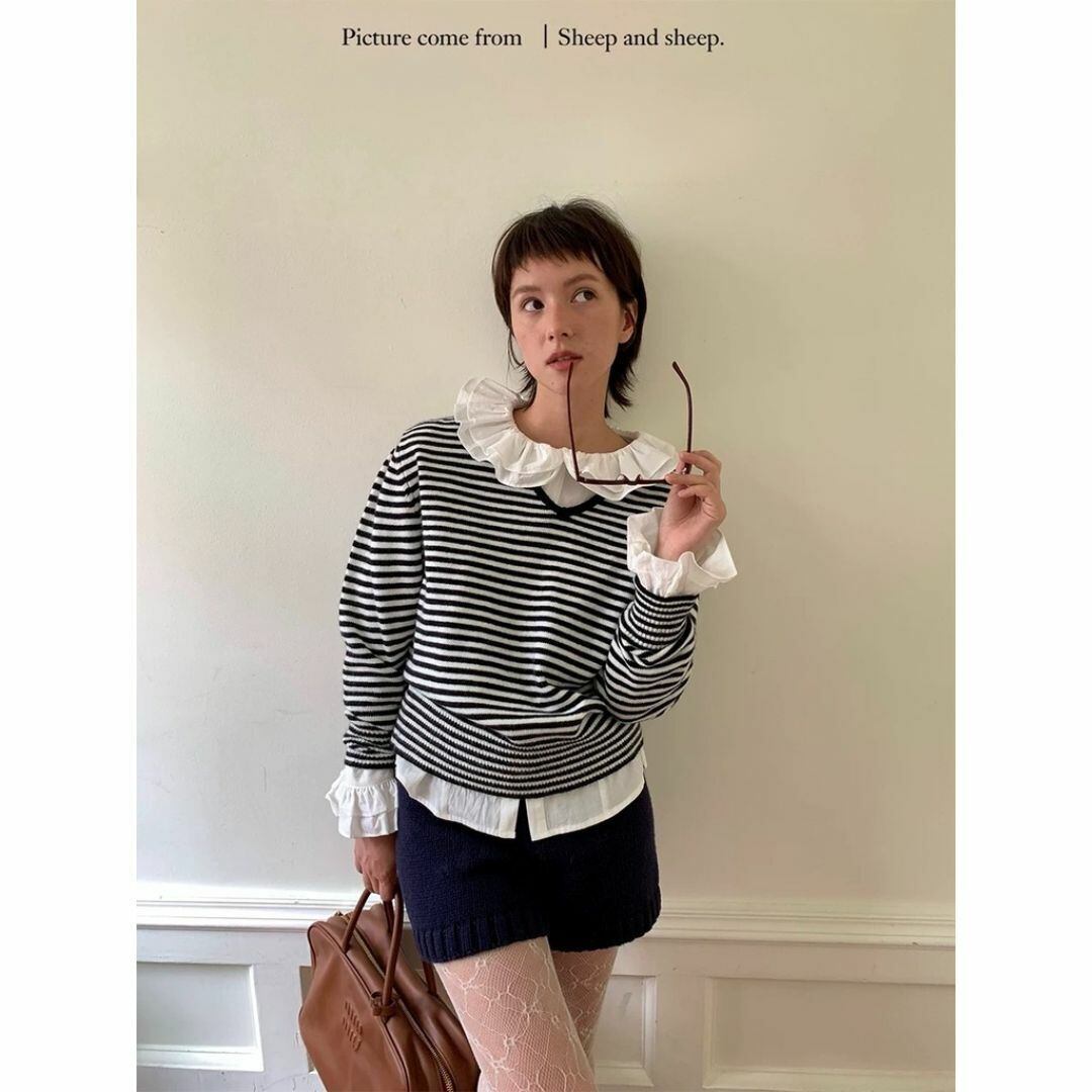 sheep and sheep Vネック ボーダー レトロ ニット カットソー