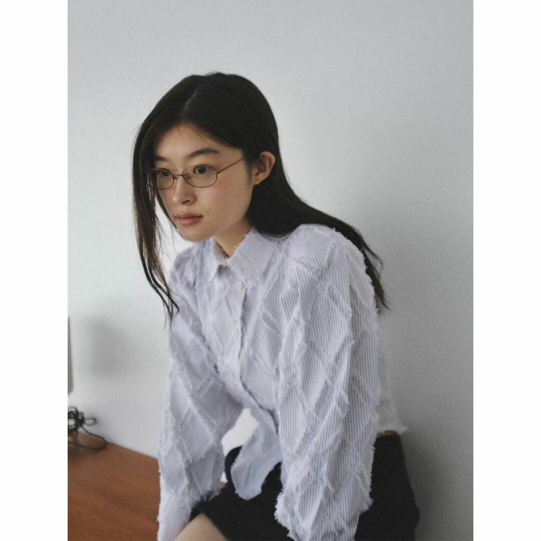 控えめなパフスリーブとウエストのカットラインが女性らしいシャツ。爽やかなブルーのストライプにフリンジの立体感のある生地で一枚で主役に◎